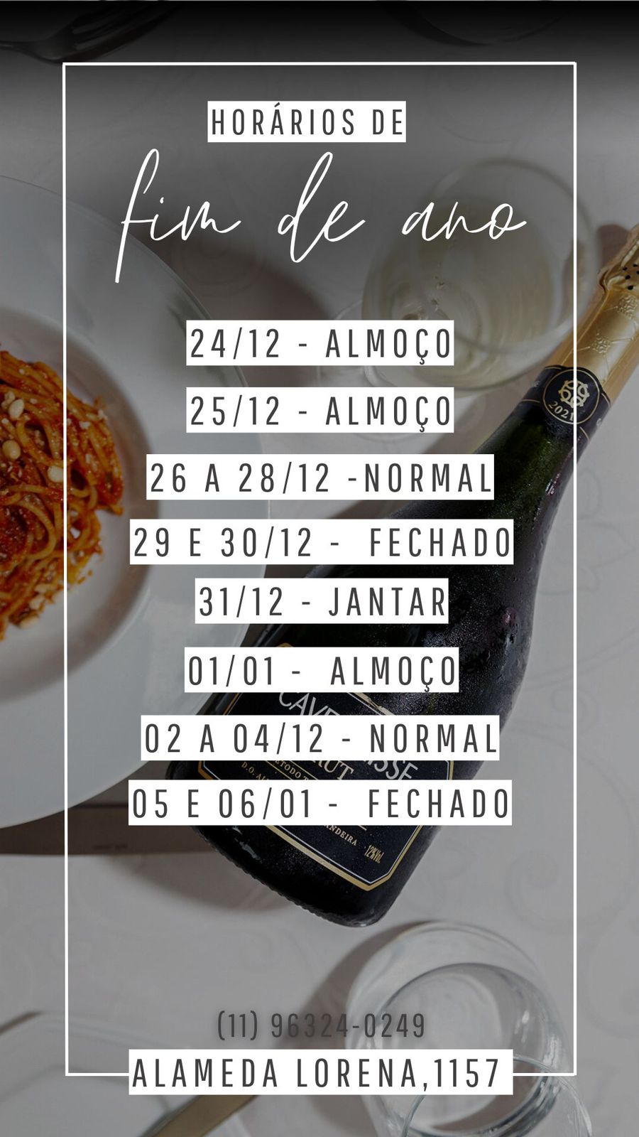 De terça a sexta-feira das 12 às 15 horas e 19 às 23 horas Sábado das 12 às 16 horas e 19 às 23 horas Domingo das 12 às 16 horas