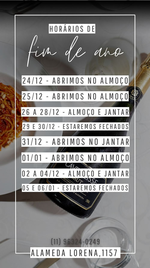 De terça a sexta-feira das 12 às 15 horas e 19 às 23 horas Sábado das 12 às 16 horas e 19 às 23 horas Domingo das 12 às 16 horas