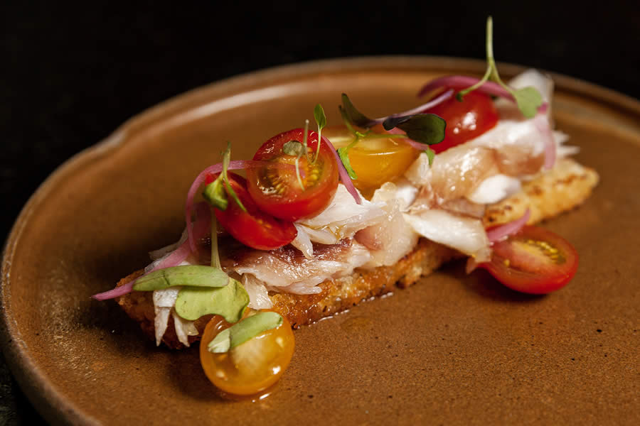 Focaccia com olhete curado e defumado, picles de cebola roxa e tomate cereja - 57,